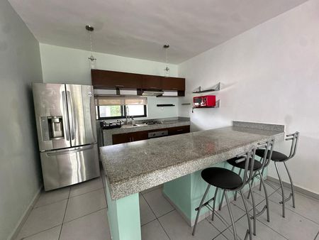 -Cocina equipada con barra desayunadora, meseta con estufa, refrigerador de dos puertas y alacenas.