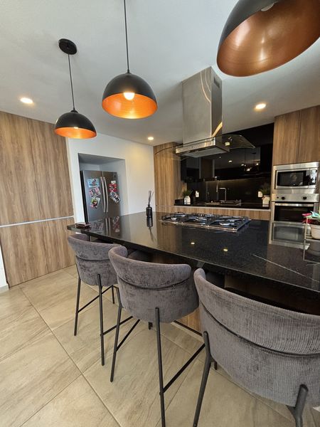 Cocina integral equipada con isla central y cubiertas de granito negro, perfecta para cocinar y convivir.