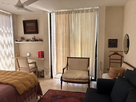 Recámara principal con aire acondicionado, cortinas, ventilador, closet de pared y baño completo