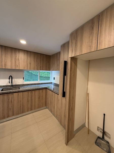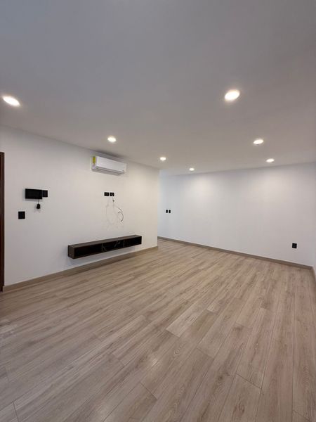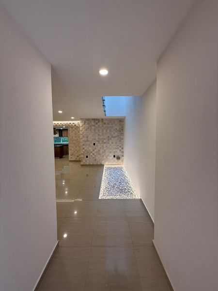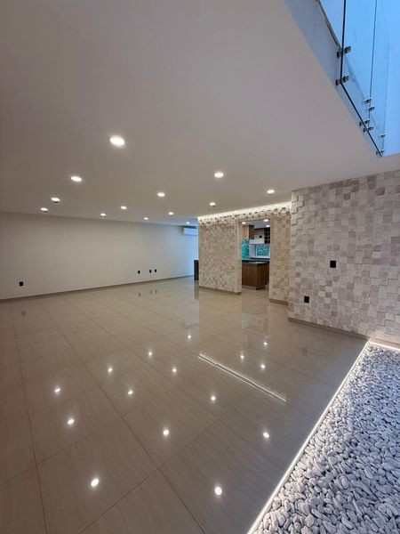 Cuenta con una amplia entrada de doble altura, espacio Para, sala y comedor con medio baño , cocina integral, equipada con vista a la terraza, la cual cuenta con paisajismo, además tiene una recámara en planta baja con baño completo y Bodega, estacionamiento para dos coches.