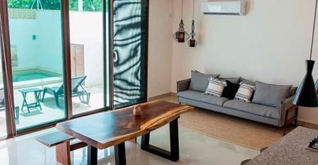 Cuenta con cortinas, mosquiteros y ventanales que son puertas hacia la alberca.