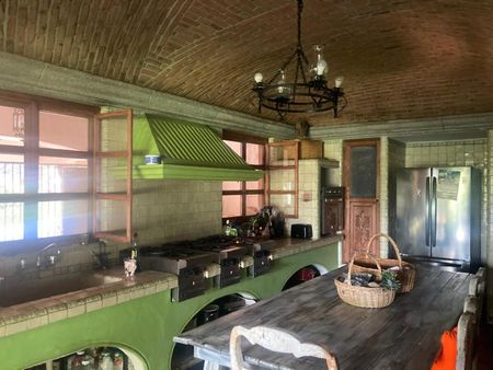 Amplia área de comedor con vista al jardín y en esta zona se tiene un espacio como cantina y cocina equipada con una gran bóveda catalana .