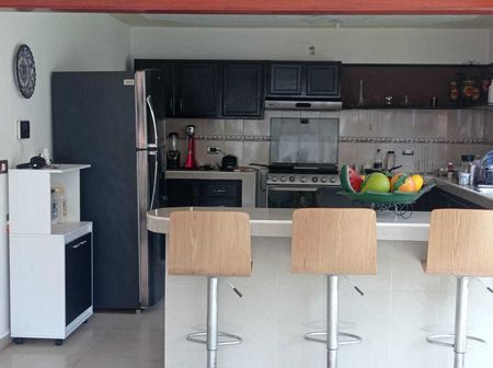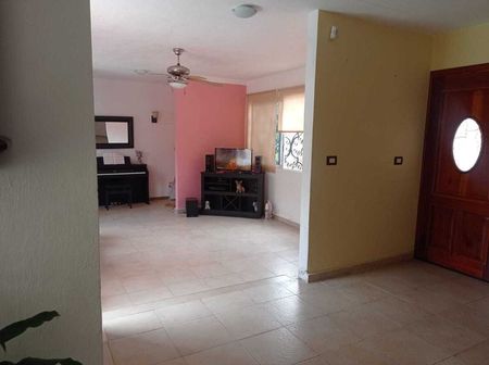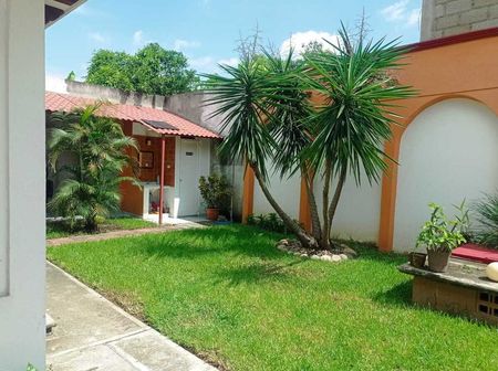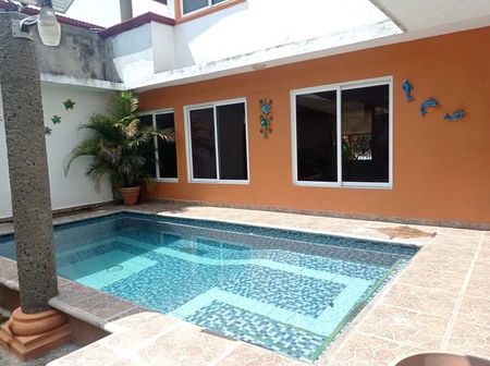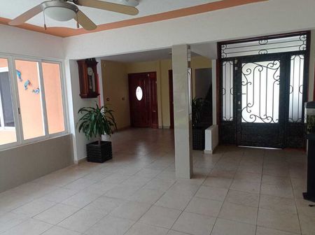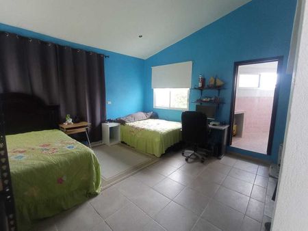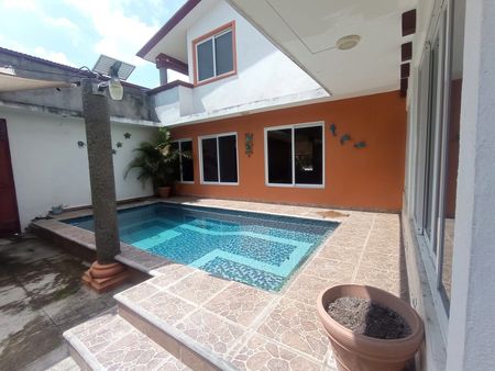 Casa con 4 recamaras con baño completo c/u, sala, comedor, cocina, estudio, baño completo en la sala y medio baño en el área de la alberca, regadera en el área de alberca, cisterna, 2 garajes para 4 autos, entrada principal con fuente y entrada por el área de cochera, cuenta con 2 balcones en las recamaras y escaleras directas hasta el techo, dónde se encuentra el área de lavado y una bodega por el área de alberca.