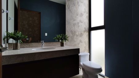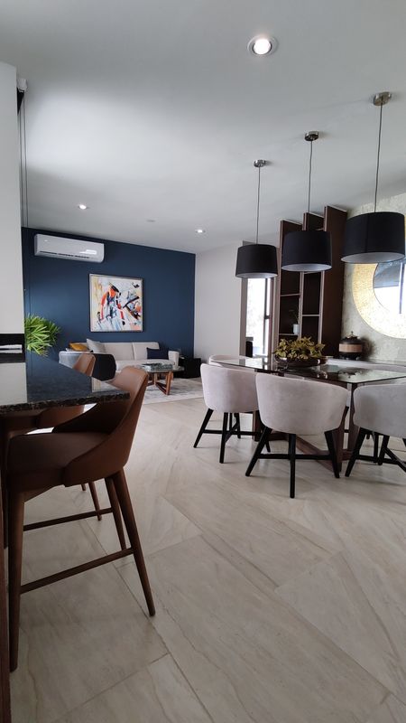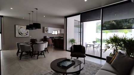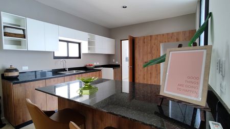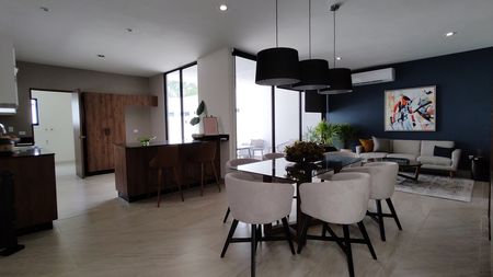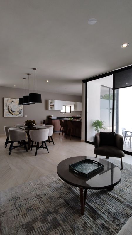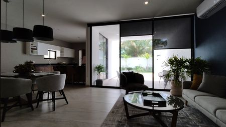 Casa en venta, moderna, amplia, con un ambiente cálido, y de arquitectura minimalista, con pisos para interiores de gran formato 50 x 100, mármol en baños, granito en cocina, terraza con pisos de estilo madera y piscina con acabado en chukum.