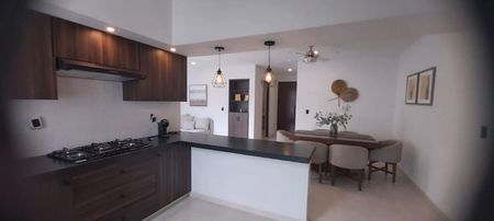 *cocina integral con barra de granito, campana, parrilla, lámparas en barra.