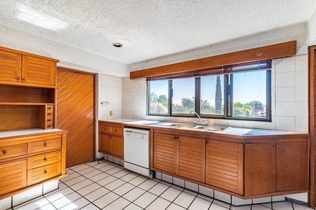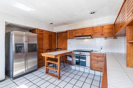La espaciosa cocina integral cuenta una extensa despensa, barra desayunador y un montacargas que facilita el subir o bajar artículos entre la planta alta y la planta baja.