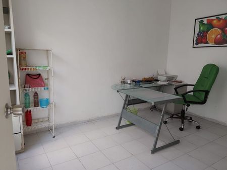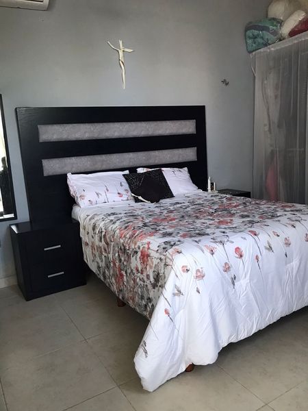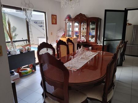 Cuenta con 3 habitaciones dobles y 1 habitación principal, la casa cuenta con 5 baños completos y un medio baño de visitas, también cuenta con una oficina, garaje techado para 2 autos, amplia cocina, sala - comedor y recibidor.