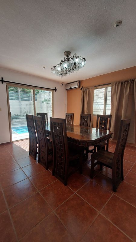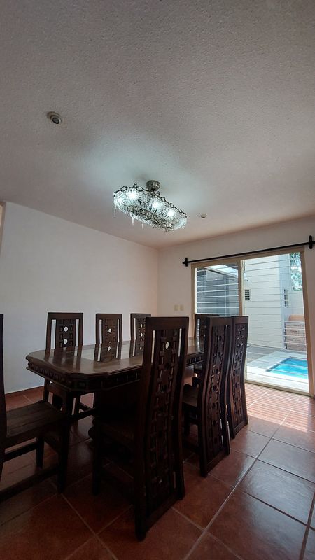 En la la te recibe un estacionamiento para dos vehículos. Al ingresar, se encuentra una cocina integral equipada. Los espacios de sala y comedor se integran de manera funcional, acompañados de un ñ . El patio trasero, donde se ubica la cuenta con una equipada con barra y tarja. En esta misma planta se encuentra el cuarto de servicio con baño .