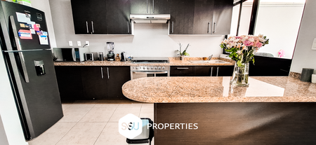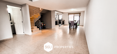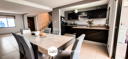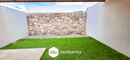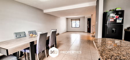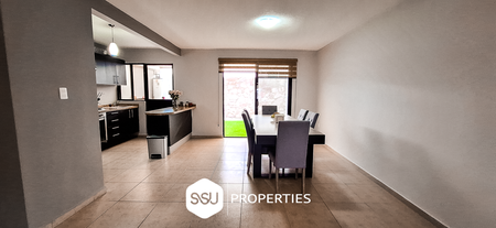 • Planta baja: estacionamiento para 2 autos, medio baño de visitas, amplia sala y comedor, cocina con barra desayunadora, patio con pasto sintético y cubierto.