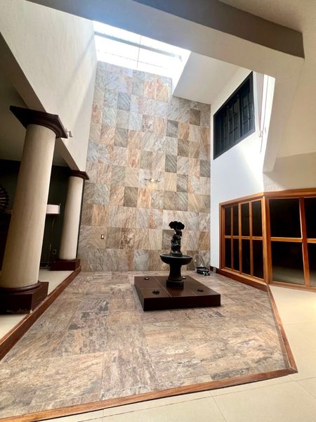 Garaje techado p/2 autos con portón eléctrico, sala comedor con independencia, elegante terraza interior con doble altura, amplio despacho con a/a, cocina integral con estufa, campana y horno, 1/2 baño, y terrazas laterales y traseras, salón multiusos tipo gimnasio y escaleras que conducen a un segundo piso independiente con área de servicio, cuarto de servicio y baño completo