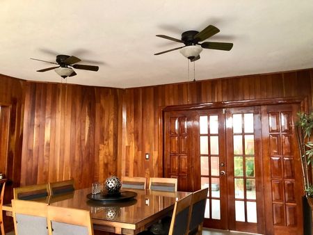 Pisos interceramic en todas las áreas y terrazas, azulejo de piso a techo en baños, aluminio y madera en todas las ventanas, madera empotrada en las paredes, lo que hace la casa muy elegante, columnas de elegancia y estilo, fuente central en la terraza interior, closets de madera tipo tambor acabado en chocolate y caoba, lámparas y ventiladores en todas las áreas, aires acondicionados en las recamaras y despacho