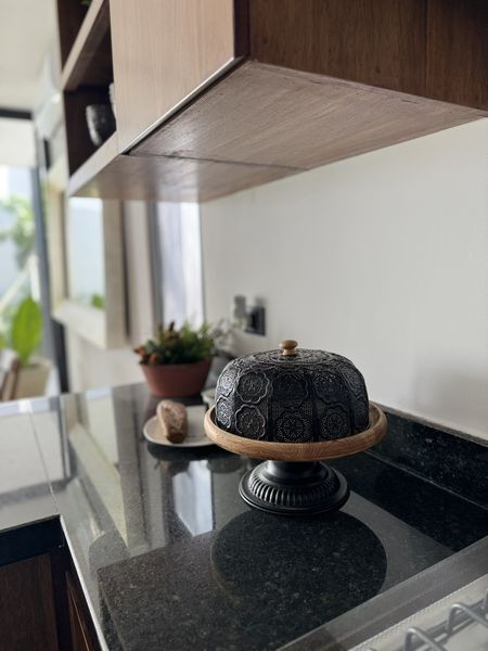 • Gavetas, especieros y cajones de madera de tzalam color natural y dos repisas de madera arriba de mesetas en cocina