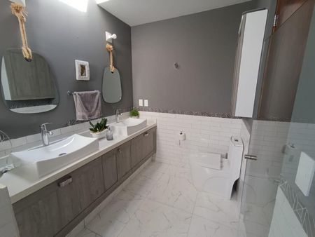 Hermosa cocina tablereada marca Somasa, con cubierta de cuarzo, equipada con electrodómesticos de alta gama, parrilla de inducción y de gas, lavavajillas, isla de trabajo y desayunador para 6 personas, alacena grande.