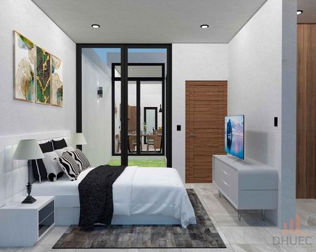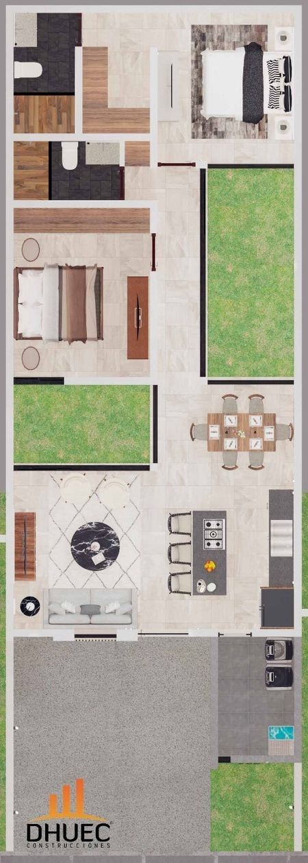 2 recámaras (principal con baño y vestidor), 1 recámara con clóset, 2 baños completos, lavabos de granito, patio de lavado, cocina integral amplia con granito e isla, sala, comedor, 2 jardínes interiores, piso rectificado 60x120, cochera para dos autos.