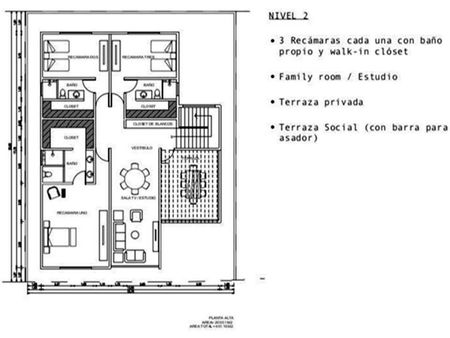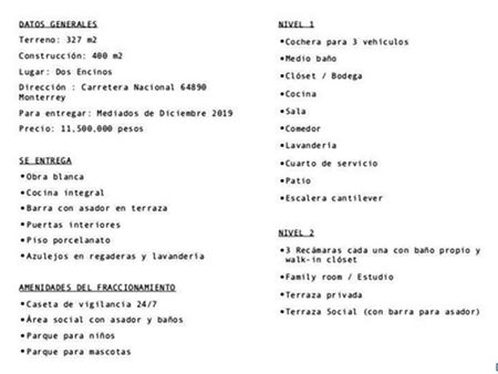 NIVEL 1: COCHERA PARA 3 AUTOS, VESTIBULO, MEDI BAÑO DE VISITAS, CLOSET/BODEGA, COCINA, ALACENA, SALA, COMEDOR, LAVANDERIA, CUARTO DE SERVICIO, PATIO, ESCALERA CANTILEVER. NIVEL 2: 3 RECAMARAS CASA UNA CON BAÑO PROPIO Y WALK'IN'CLOSET, FAMILY ROOM / ESTUDIO, TERRAZA SOCIAL (CON BARRA PARA ASADOR. SE ENTREGA CON COCINA INTEGRAL, BARRA CON AZADOR ENTERRAZA, PUERTAS INTERIORES DE MADERA, PISO DE PORCELANATO, WALK- IN CLOSETS, GRANITO EN LAVABOS, CANCELES DE CRISTAL TEMPLADO. AMENIDADES: CASETA DE VIGILANCIA 24/7, AREA SOCIAL CON ASADOR Y VAÑOS, PARQUE PARA NIÑOS, PARQUE PARA MASCOTAS. DATOS GENERALES: AREA: 327 M2, CONSTRUCCION TOTAL: 400 M2 , PLANTA BAJA : 200.65 M2, PLANTA ALTA 200.51 M2.