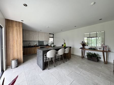 CASA PRINCIPAL: Cochera para 3 autos, baño completo, sala, comedor, cocina con barra de granito, jardín.