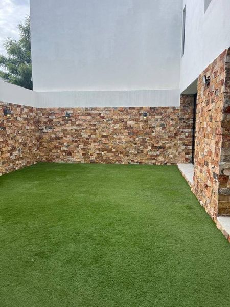 -Járdin con pasto sintetico con muro revertido con travertino.