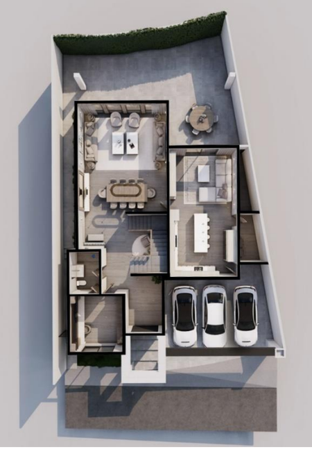 Primer nivel: Recibidor de triple altura, oficina / recámara, 1 baño completo, family room espacioso, cocina integral y espacio de sala con ventanales de piso a techo, amplia terraza jardín con asadores.