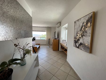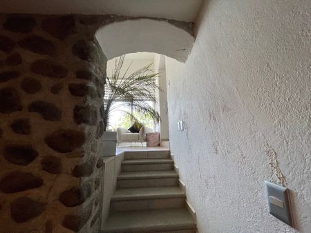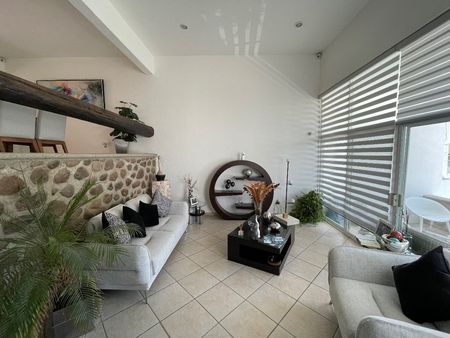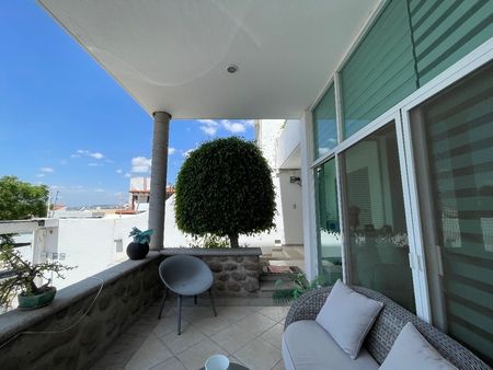 Entrando a la casa recibidor con closet de vistas, área de sala y bajando un desnivel una área de Tv o estudio semi cerrado. Subiendo comedor, cocina súper equipada cerrada y una pequeña terraza interior. Patio exterior.