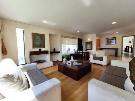 Cuenta con una amplía sala y comedor con chimenea y tiene salida a una terraza con una vista de ensueño, todo el piso es de marmol y madera de Encino,