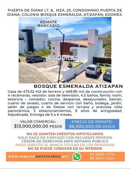 Casa en Venta en Bosque Esmeralda de Remate Bancario de 473.52 m2 de terreno y 409.95 m2 de construcción con 4 recámaras, vestidor, sala de televisión, 4.5 baños, family room, estancia – comedor, cocina, despensa, desayunador, terraza, cuarto de lavado, cuarto de servicio con baño, bodega, patio, jardín, salón de juegos, 3 estacionamientos, 9 años de antigüedad. Valor Comercial: $13,000,000.00 pesos. Adjudicada. Entrega de 4 a 5 meses. PRECIO DE REMATE: $6,500,000.00 PESOS. Pago directo al banco. Incluye gastos jurídicos y honorarios del despacho. NO Incluye lanzamiento ni gastos notariales. Cesión de derechos adjudicatarios ante notario público. Revisión de expediente jurídico. Ubicada dentro del Fraccionamiento Puerta de Diana, Colonia Bosque Esmeralda, Atizapán, Estado de México, C.P. 52930. Los remates bancarios no se pueden adquirir mediante créditos hipotecarios. El pago tiene que ser de contado con RECURSOS PROPIOS. Tiempo de entrega: 4 a 6 meses. Tenemos más de 700 inmuebles de recuperación bancaria. Solicita catálogo vía WhatsApp al 5635411424 y 5559897315. Visite: RematesHipotecarios.mx