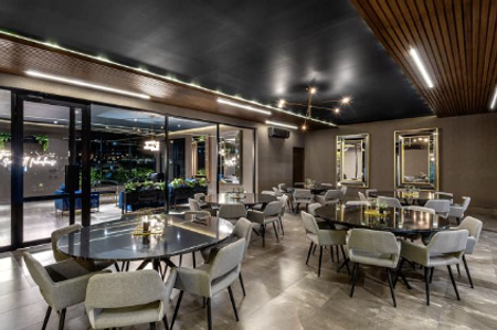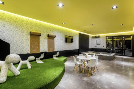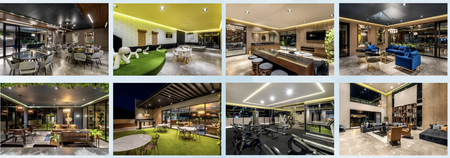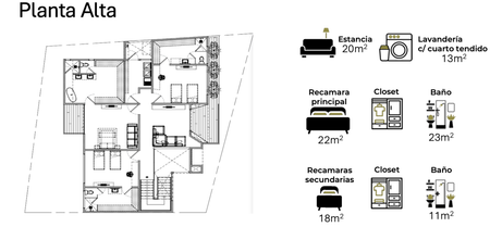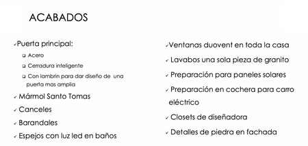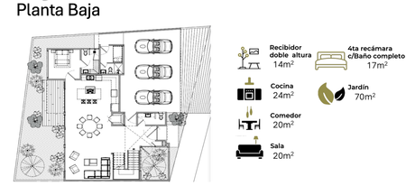 Recibidor doble altura, sala-comedor, cocina, recámara con closet vestidor y baño completo, cuarto de servicio, jardín con terraza y cochera para 3 carros.