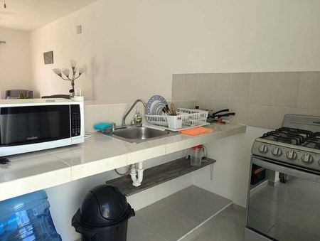 -Cocina con estufa y horno, microhondas, refrigerador, cafetera y vajilla para 4 personas.