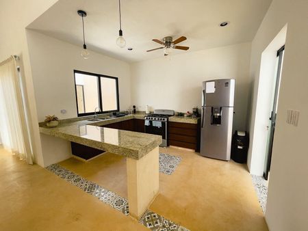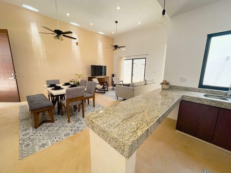 Cocina con meseta de granito, carpintería, y ventilador de techo.