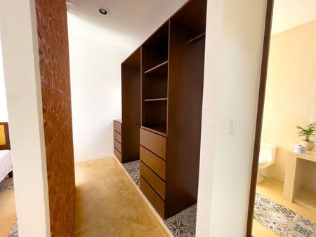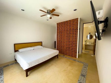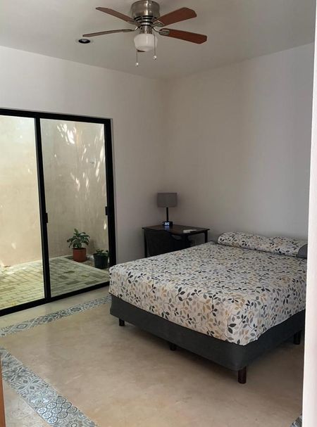 Recámara 2- Equipada con closet, aire acondicionado, ventilador de techo, base y colchón queen size, patio interior y baño completo.