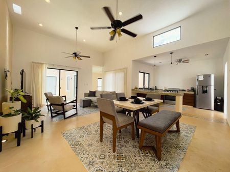 Sala y sillas laterales, credenza, comedor, refrigerador, estufa, cama queen size