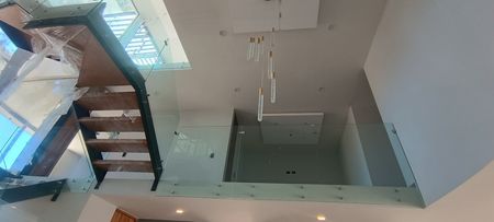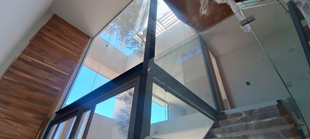 - Jardín interior con grandes ventanales que dan iluminación a la casa y un pino visible desde el interior.