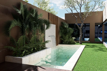 Resalta el paisajismo de su jardín interior como un espacio de meditación y contemplación +una alberca con cascada para relajación y entretenimiento.