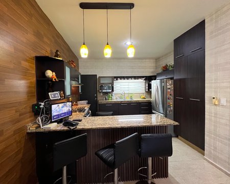 • Recubrimiento de lambrín en escaleras y barra desayunadora.