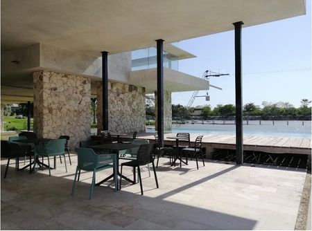 Terraza exterior para piscina con barra, tarja y meseta de servicio (área no techada)
