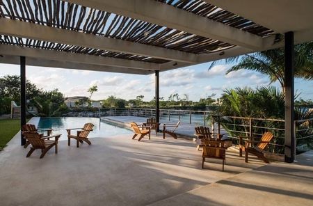 Terraza techada, de 9.70m x 4.00m, con vistas al jardín principal y área de piscina