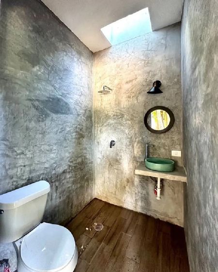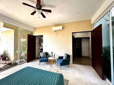 Habitación principal con baño completo, closet vestidor, dos jardines interiores, vista a la terraza, aire acondicionado y ventilador.