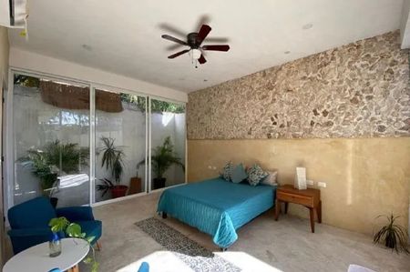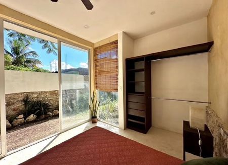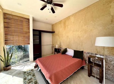 Recamara secundaria con baño completo, closet, vista a la piscina, aire acondicionado y ventilador.