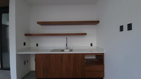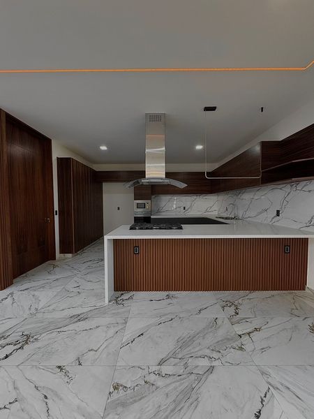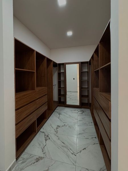 Carpintería con madera de parota en puertas, cocina, closets y muebles de baño.