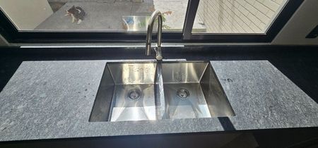 * Cocina cerrada con granito Jeder Finish, doble tarja, preparación para lavavajillas, cajones para cacerolas, despensa, espacio para refrigerador grande con toma de agua, barra para desayunar.