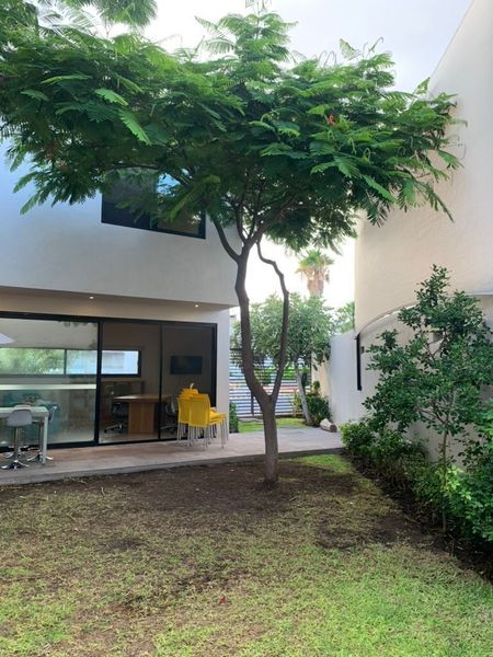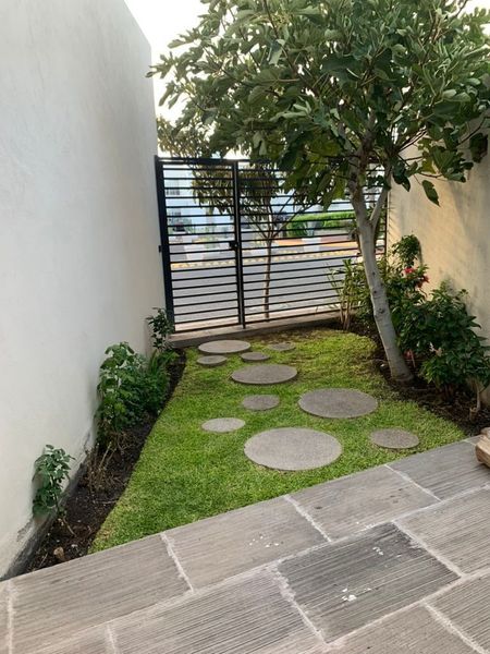El jardin central los arboles grandes dan buena sombra y tiene entrada adicional para salir a la calle de manera independiente.