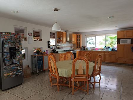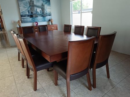 Comedor de 10 sillas, espacio para cantina, alacena y cocina con acceso desde el estacionamiento.