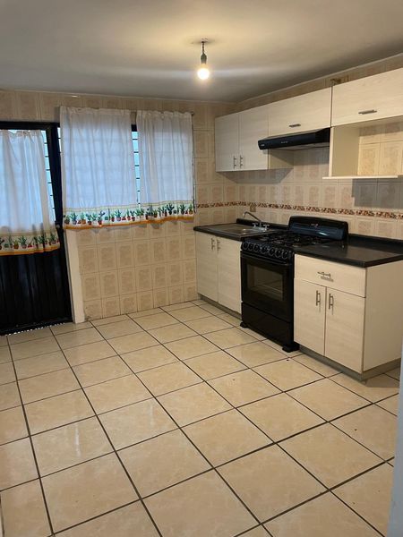 Cocina equipada : muebles de cocina , estufa , campana y barra desayunador.