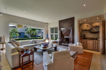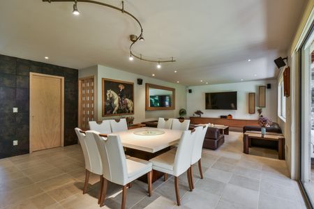 EN EL EXCLUSIVO FRACCIONAMIENTO HACIENDA SANTA FE CON ESTRICTA VIGILANCIA Y ESPECTACULARES AMENIDADES. La casa está desarrollada en 2 niveles, impecable, con acabados de lujo, preciosas vistas desde todas las habitaciones. Cuenta con gran vestíbulo, sala de tv y ante comedor con salida a terraza techada y al jardín, cocina equipada, sala muy amplia con preciosa chimenea y gran comedor. En planta alta, 3 recámaras cada una con baño y vestidor, la principal con vapor y jacuzzi, y las otras dos con tapanco, estudio con opción a 4a recámara. Tiene 2 cuartos de servicio, 4 bodegas y 6 lugares de estacionamiento.