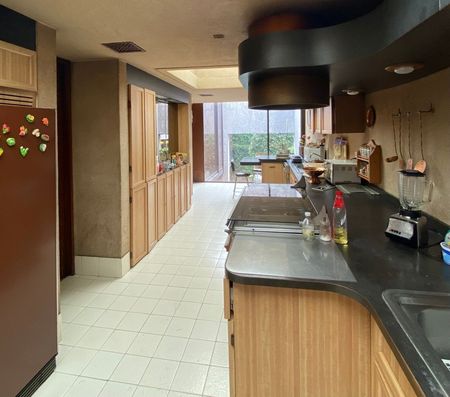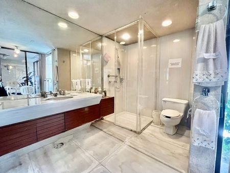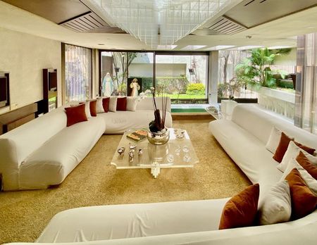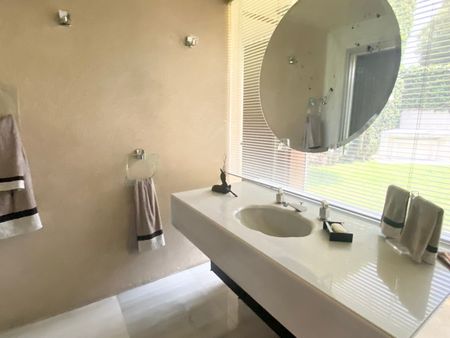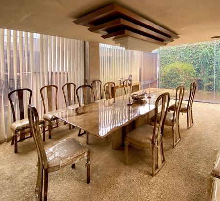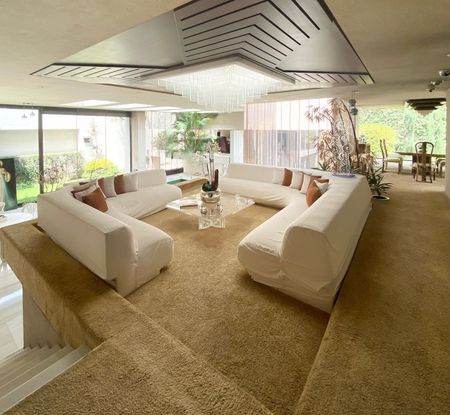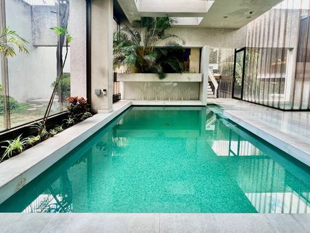 En planta baja consta de sala, comedor con ventanales de piso a techo y vista al jardín, espaciosa cocina, desayunador, y medio baño de visitas. En medio nivel abajo, alberca interior rodeada de una hermosa estancia con pisos y escalones de mármol, salón de juegos con sala y mesa de juegos con soberbia barra de bar con todos los componentes para disfrutarla y cava en piedra volcánica con exquisita iluminación indirecta. En siguiente nivel, recámara principal tipo master suite con baño y enorme vestidor de 2 niveles, segunda recámara con baño, gimnasio, vestidor y terraza y 3a recámara con closet y baño; sala de estar con vista a la alberca, y acceso privado a la recámara principal. El jardín es plano, con una terraza techada muy agradable. Tiene 3 cuartos de servicio, con 2 baños, cuarto de lavado, caseta de vigilancia, y cuarto de máquinas.