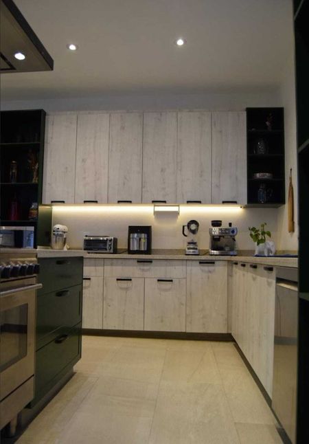 Isla de granito con cascada de 1.5 x 2.85 m, vitrinas retroiluminadas y encimeras de diseño