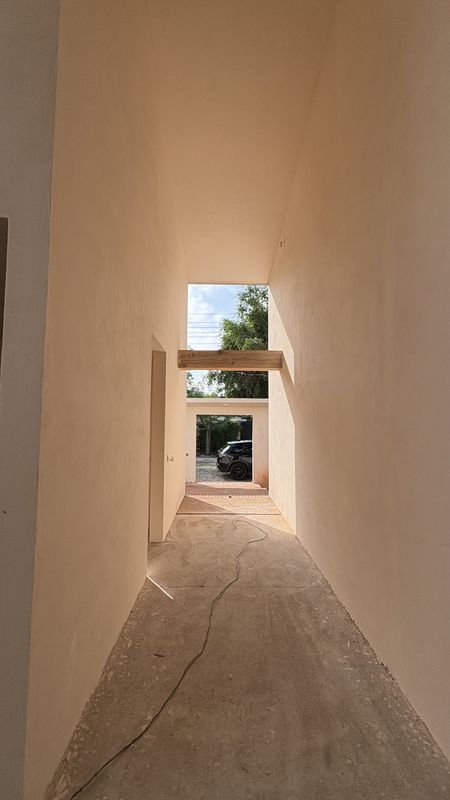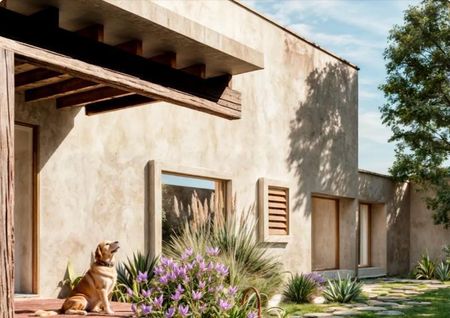 un suave tono beige de nanocal, combinan con los techos de teja y las vigas