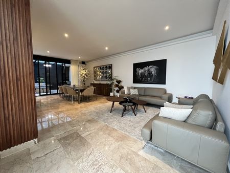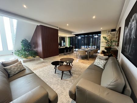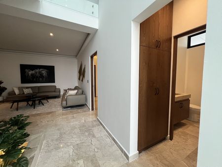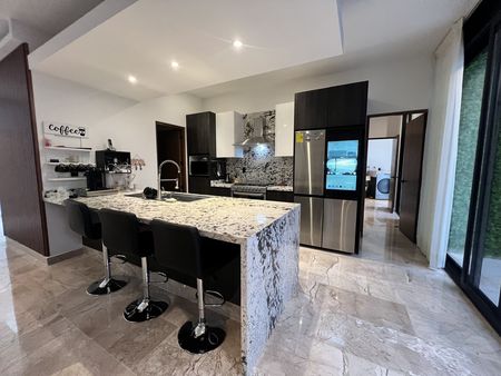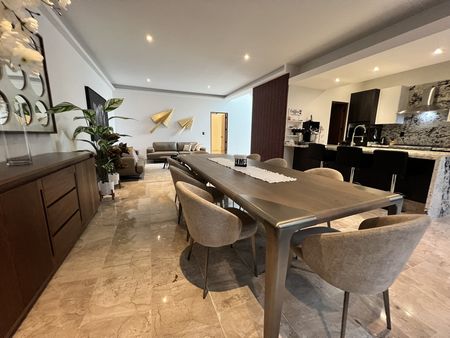 Sala y comedor con espacios amplios que te conectan al gran punto de reunión que sería la terraza y yacuzzi con un techo que se despliega para que disfrutes de el sol mientras estás en el Jacuzzi.