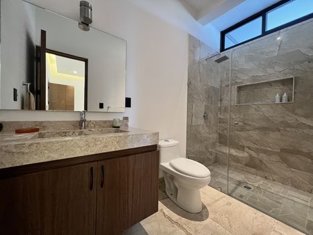 Recámara principal con mini splits y baño completo y vestidor, dos recámaras secundarias con baños completos y vestidores.