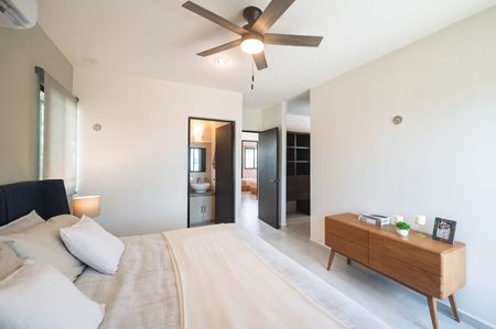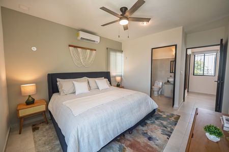 2 recámaras en planta alta, ambas con aire acondicionado; la recámara principal cuenta con salida a terraza, closet vestidor y baño privado con cancel de vidrio templado para mayor privacidad y confort.