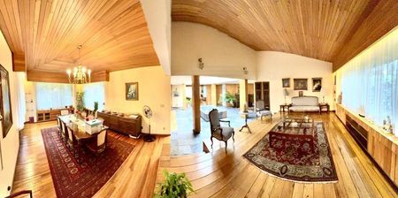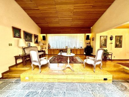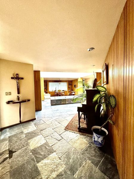 Para el conocedor del buen vivir. Dispuesta en cómodos medios niveles juega con alturas. Vestíbulo de pizarra verde recibe con elegancia. Pulcro 1/2 baño de visitas con clóset. Señorial personalidad contemporánea sobria, sin embargo, acogedora. Sala principal es recinto social que estimula la convivencia, con ventanales y plafones de madera en cada ambiente social. Fino comedor congrega para compartir la buena mesa, sale a la terraza y amplios jardines. Ante-comedor invita nutridas conversaciones. Cocina integral de amplias encimeras, gabinetes despensa, alacena goza de generosa amplitud y funcional diseño ofrece espacio para instalar isla central. Sala de juegos recibe holgadamente mesa de billar.
